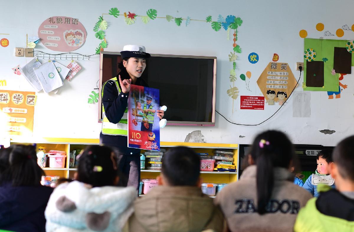 1月8日,第六個(gè)中國人民警察節(jié)前夕,安徽省巢湖市公安局交管大隊(duì)民警走進(jìn)轄區(qū)幼兒園,為小朋友們講解“中國人民警察節(jié)”的由來及道路交通安全知識(shí)。