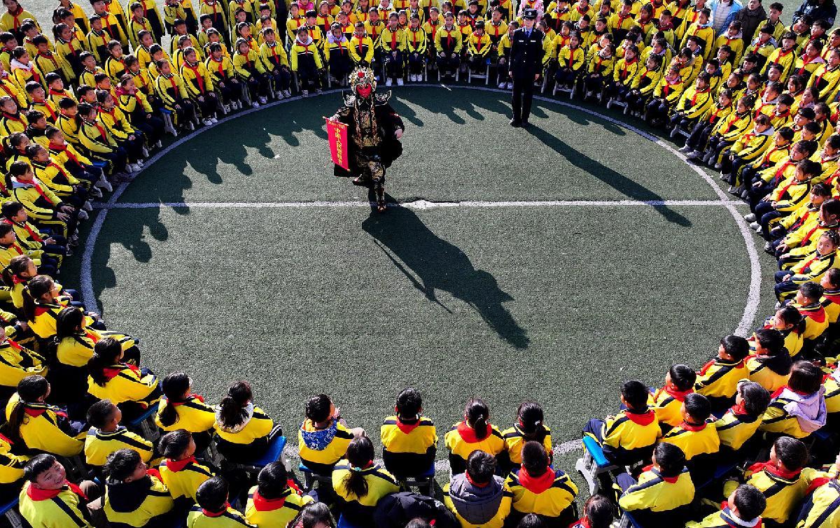 1月9日,在山東省棗莊市市中區(qū)齊村鎮(zhèn)渴口中心學(xué)校,棗莊市公安局市中分局一名輔警用“變臉”的表演方式向師生們宣傳法律知識(shí)。連日來,棗莊市公安局市中分局開展形式多樣的主題活動(dòng),迎接中國人民警察節(jié)的到來。