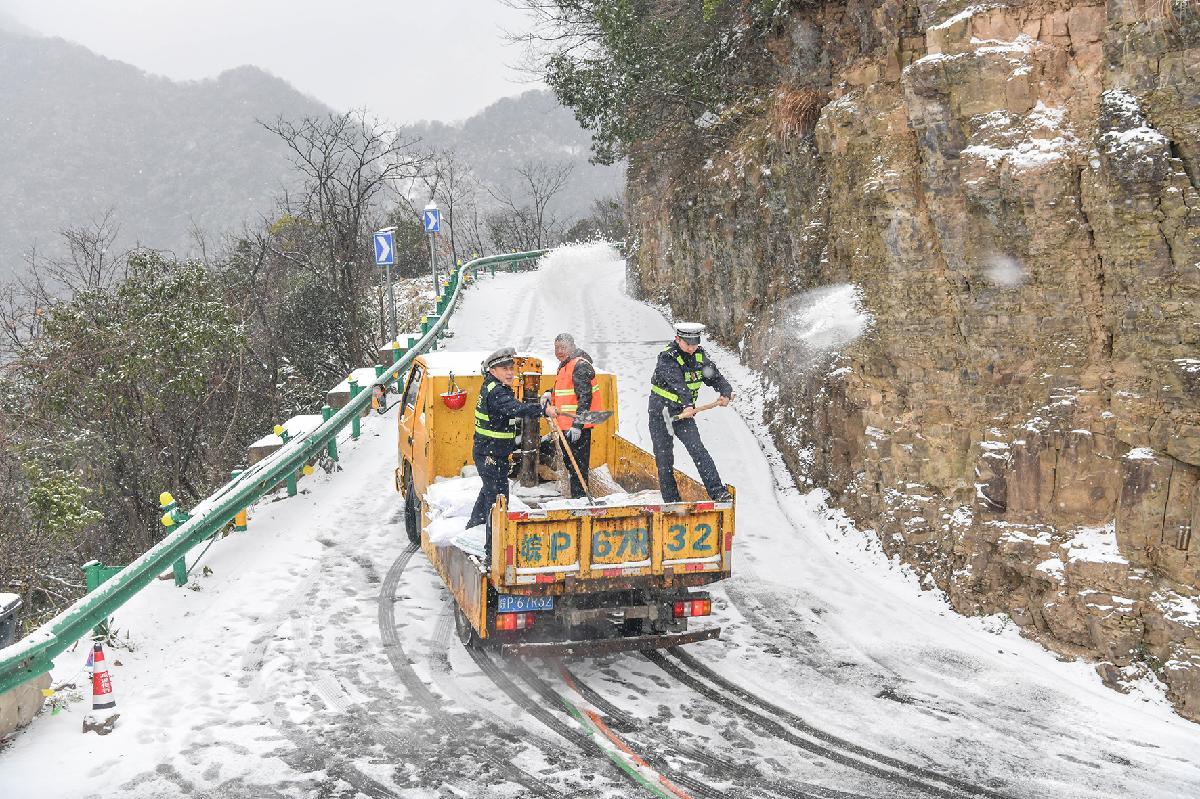 1月20日,安徽省涇縣出現降雪降溫天氣。涇縣公安局交管大隊組織警力加強S345省道巡邏疏導,全力保障路面安全暢通。