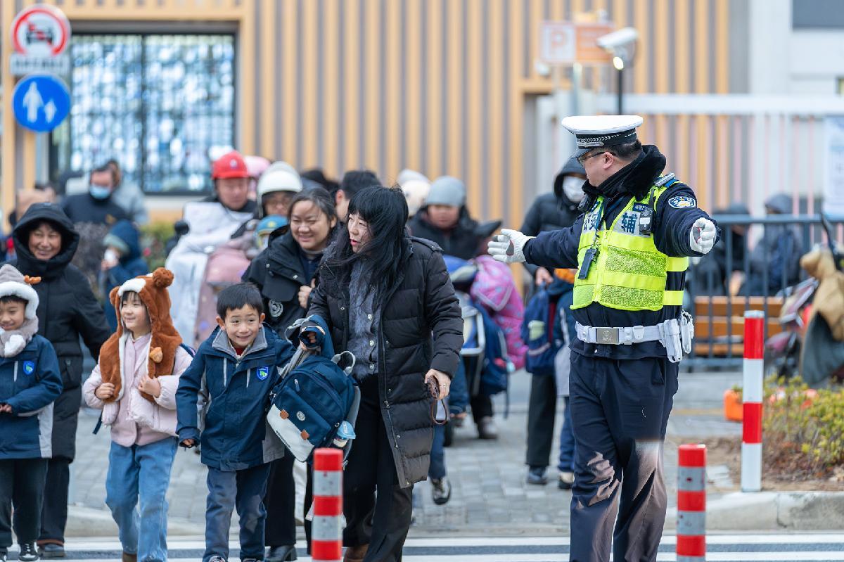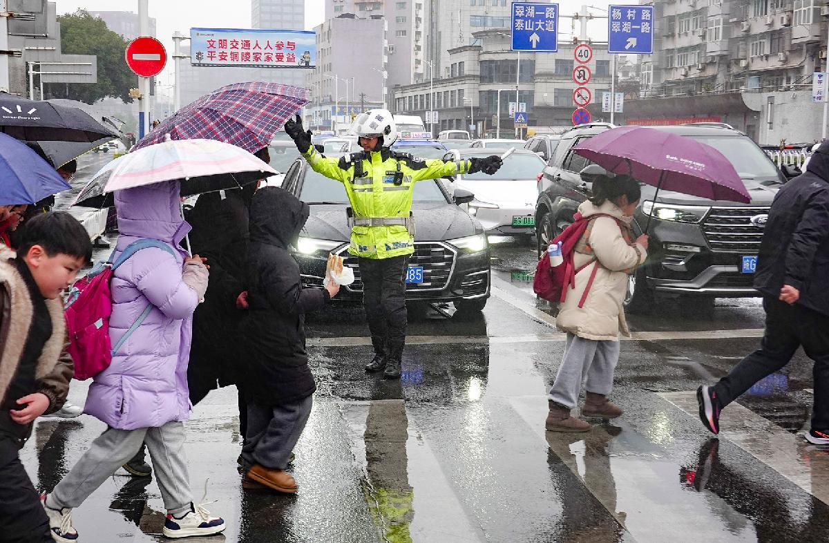 1月19日,安徽省銅陵市雨雪低溫天氣來襲。銅陵市公安局交管支隊立即啟動應急預案,增派中小學?!白o學崗”警力,全力守護學生出行安全。