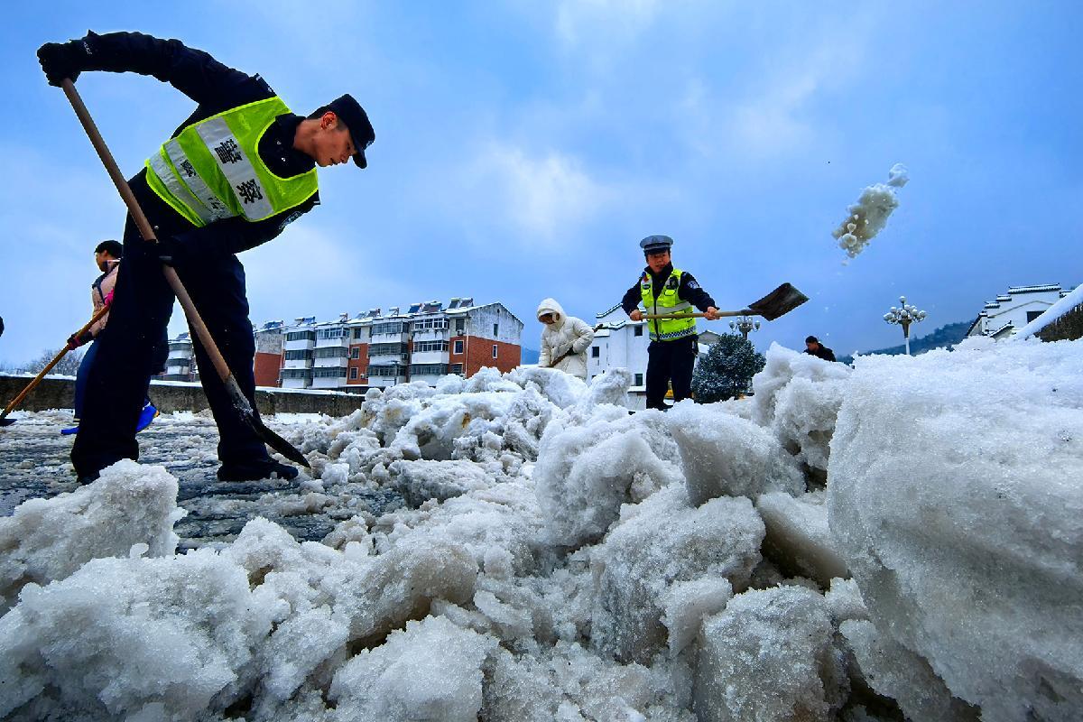 1月20日,安徽省馬鞍山市含山縣公安局民警在冰雪路面疏導交通,保障群眾安全出行。