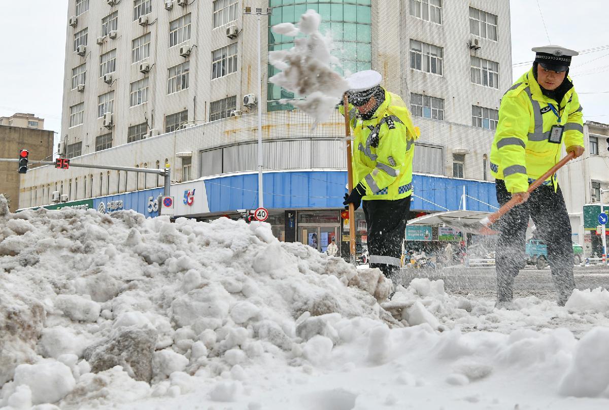 1月20日,安徽省阜南縣大范圍降雪。阜南縣公安、交通運輸、城市管理等多部門聯動保障交通暢通。