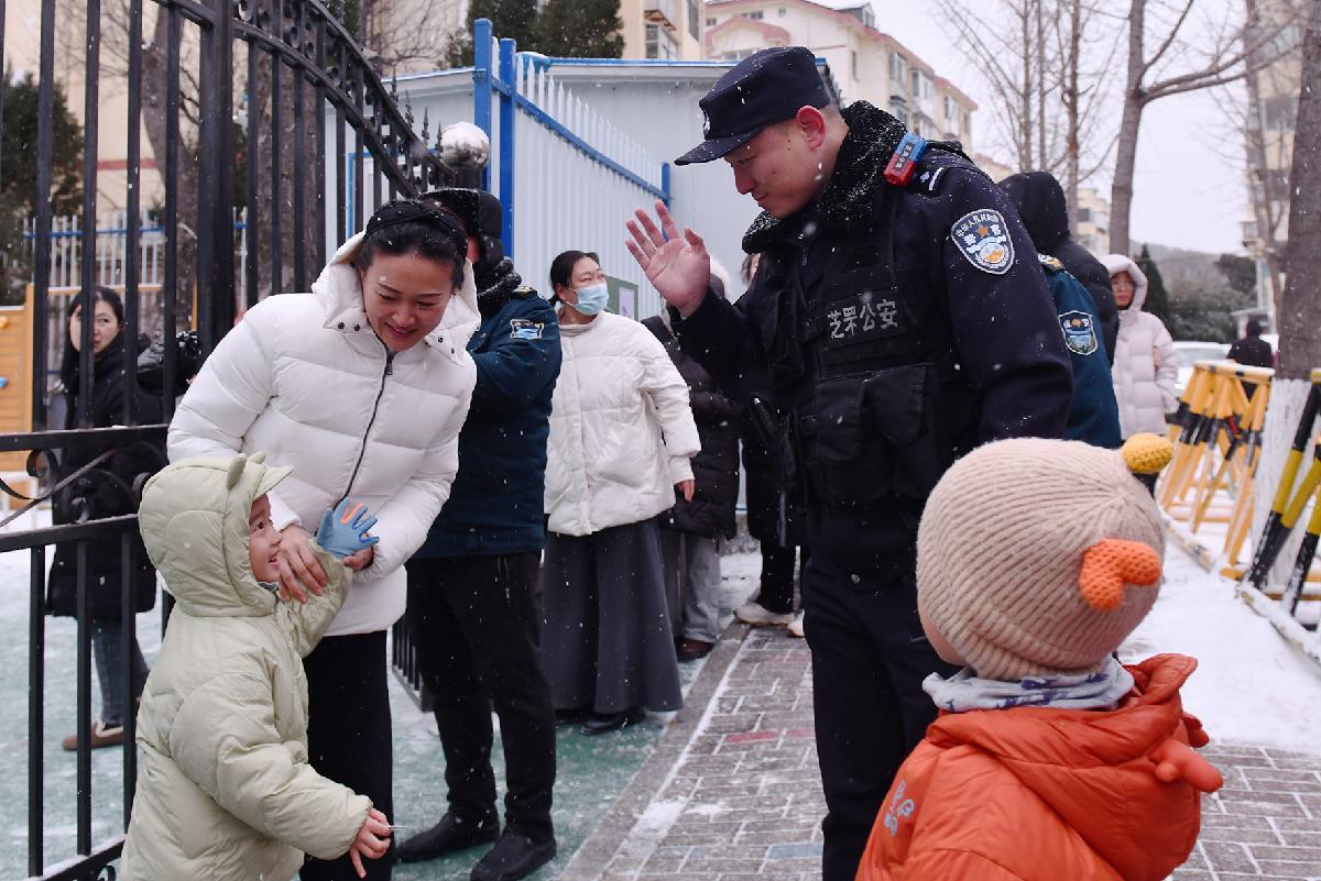 1月19日,山東省煙臺市公安局芝罘分局民警冒雪在轄區(qū)幼兒園門口執(zhí)勤,護送孩子們平安放學。