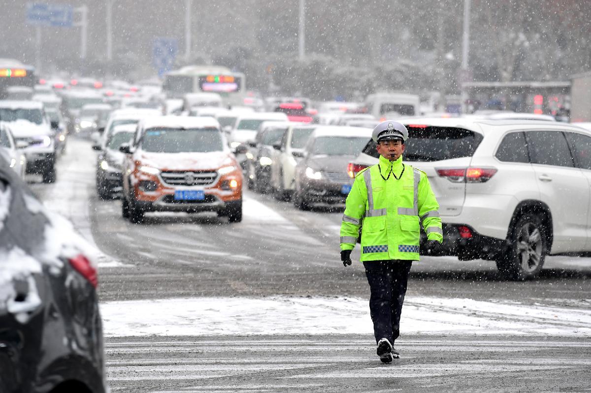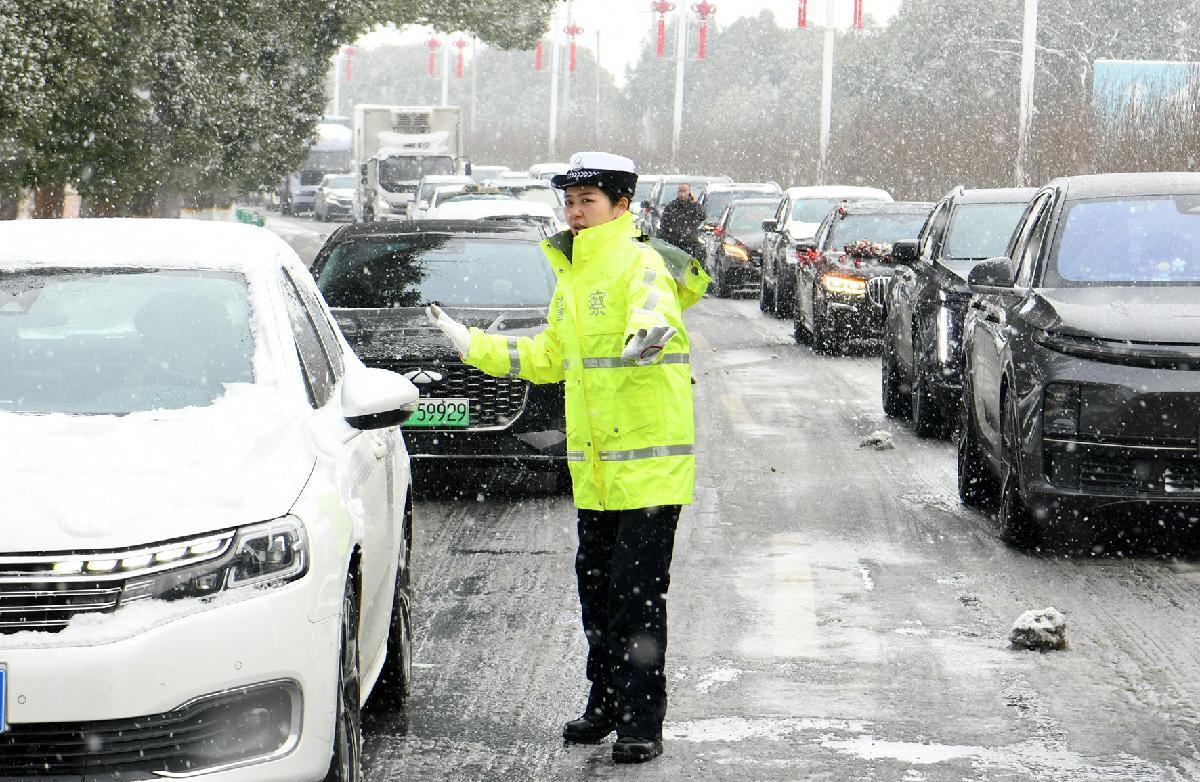 1月20日,安徽省蕪湖市主城區(qū)迎來暴風雪天氣。蕪湖市公安局交管支隊弋江大隊全警上崗,疏導交通,確保轄區(qū)道路暢通有序。