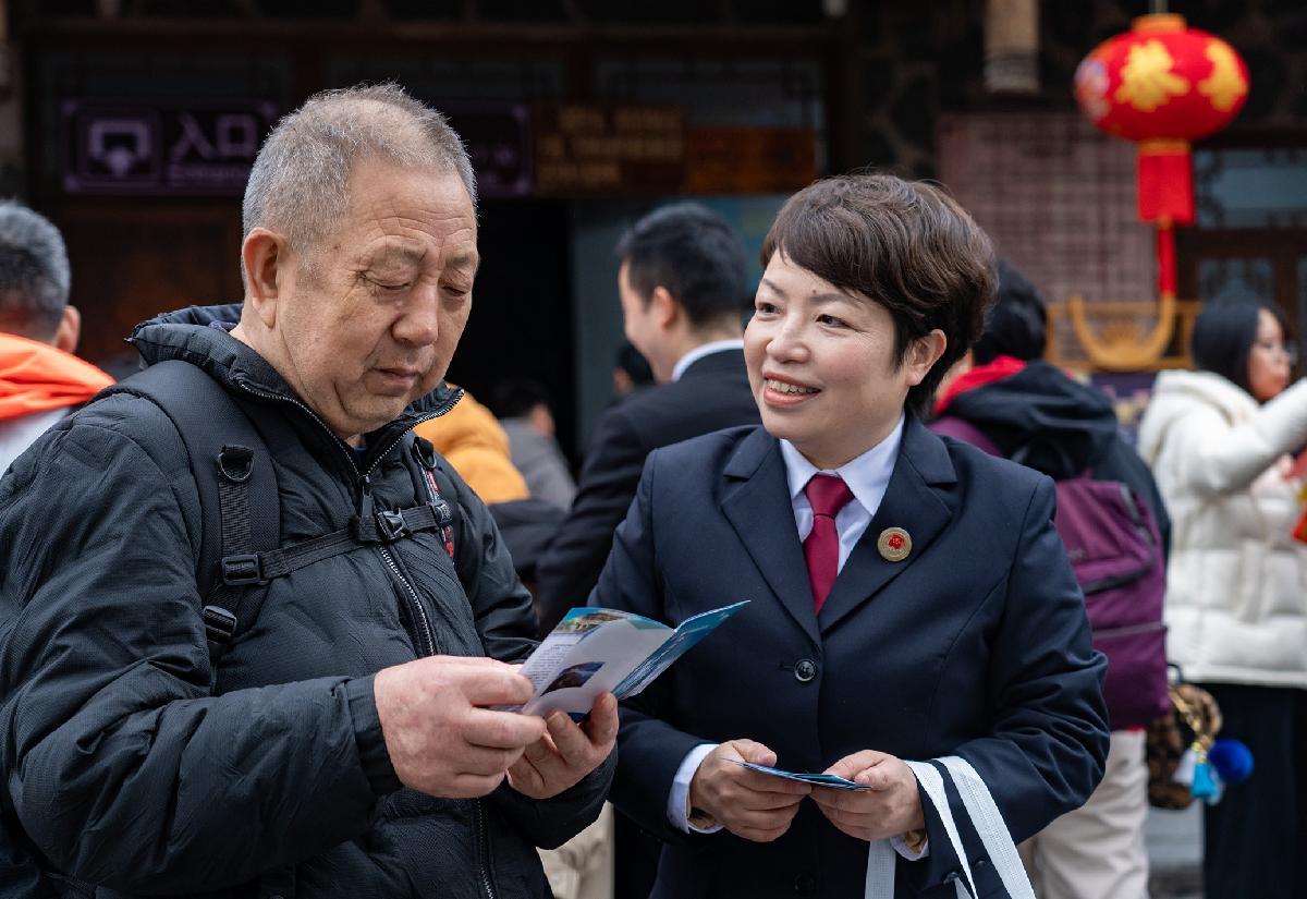 2月9日,貴州省黔東南苗族侗族自治州雷山縣司法局創(chuàng)新普法形式,將法律知識(shí)包裝成特色“年貨”,組織法治宣傳教育志愿者在景區(qū)開展豐富多彩的新春法治宣傳。