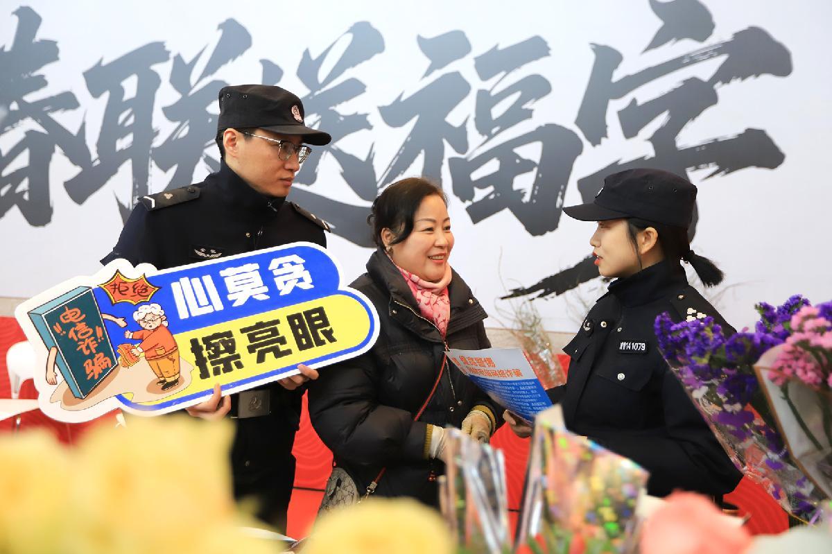 2月10日,農(nóng)歷小年。安徽省蕪湖市公安局弋江分局民輔警來(lái)到迎春年貨節(jié)市集,開(kāi)展“賀新春 話(huà)反詐”安全知識(shí)宣傳。