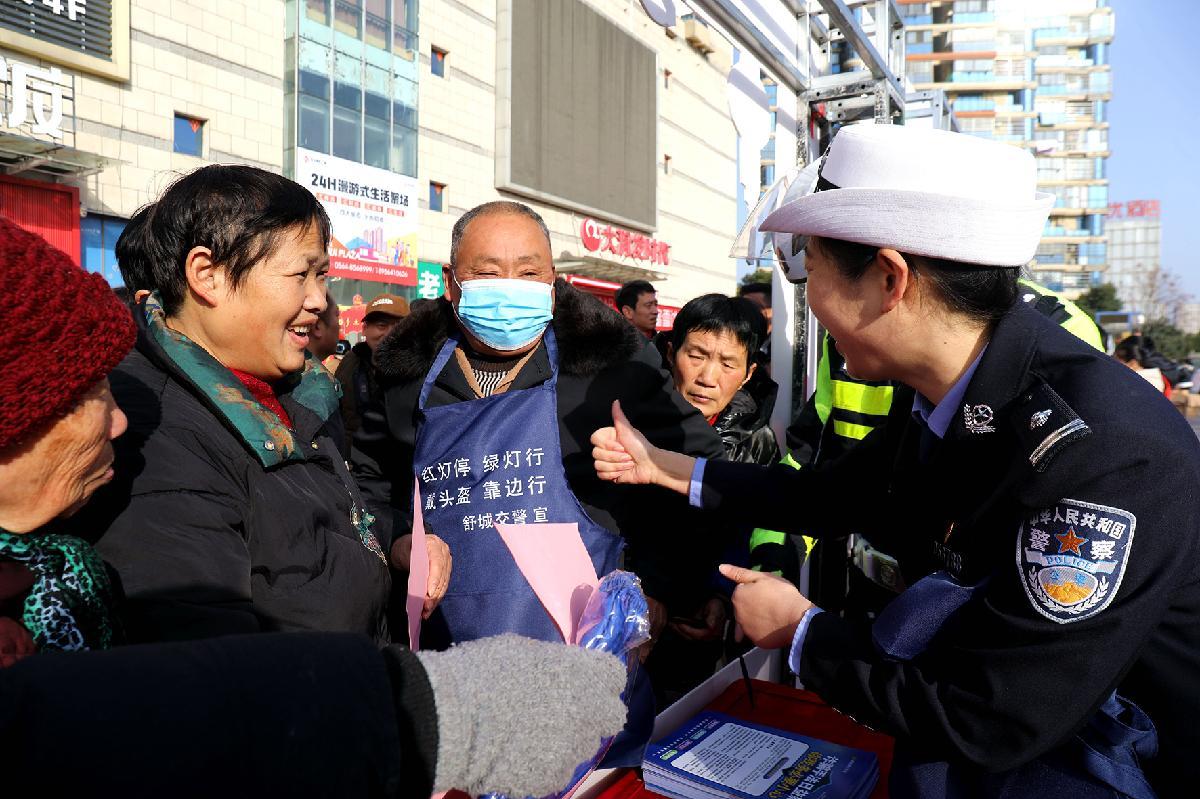 2月11日,安徽省舒城縣公安局交管大隊(duì)組織民輔警在集市“擺攤”,向群眾宣傳春節(jié)期間交通出行安全知識(shí)。