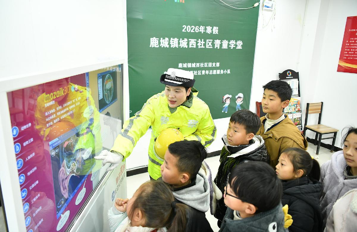 2月10日,安徽省阜南縣公安局交管大隊(duì)民警在鹿城鎮(zhèn)城西社區(qū)青童學(xué)堂里向孩子們講解假期出行安全知識(shí)。