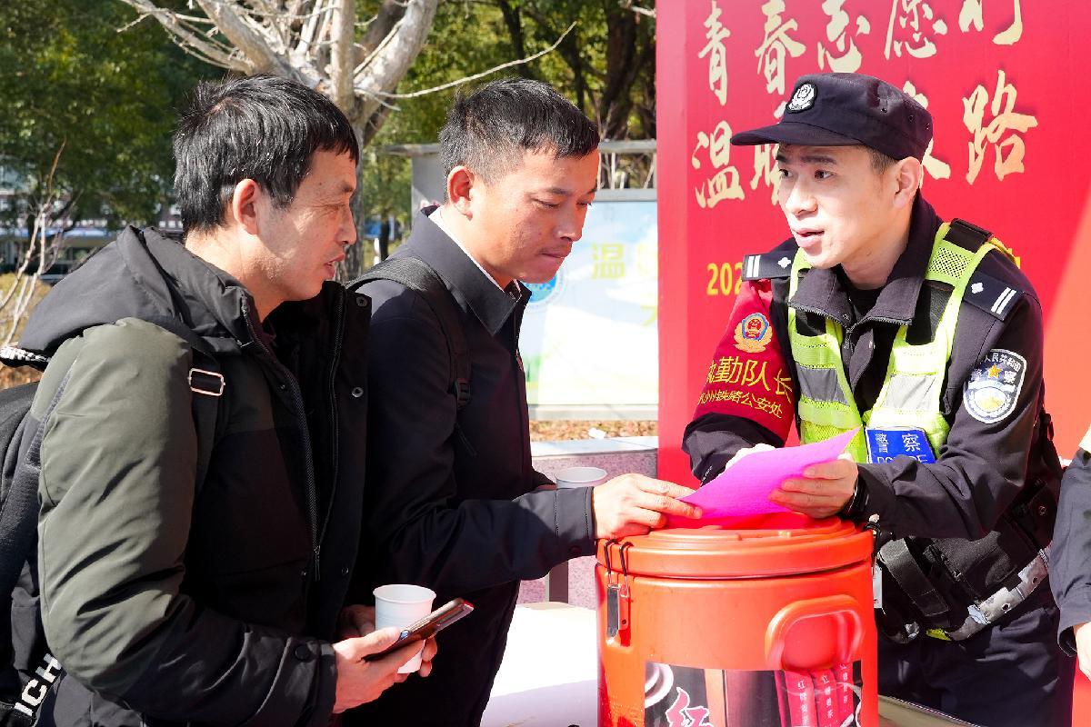 2月11日,杭州鐵路公安處臺(tái)州站派出所民警在便民服務(wù)崗為返鄉(xiāng)旅客送上暖身姜茶,并宣講安全出行和防詐騙知識(shí)。