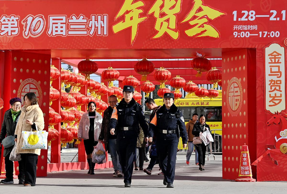 2月10日,甘肅省蘭州市公安局城關(guān)分局鹽場(chǎng)路派出所民警輔警在年貨集市上巡邏,向經(jīng)營(yíng)業(yè)主宣傳安全知識(shí),積極服務(wù)市民群眾,全力打造“平安集市”。