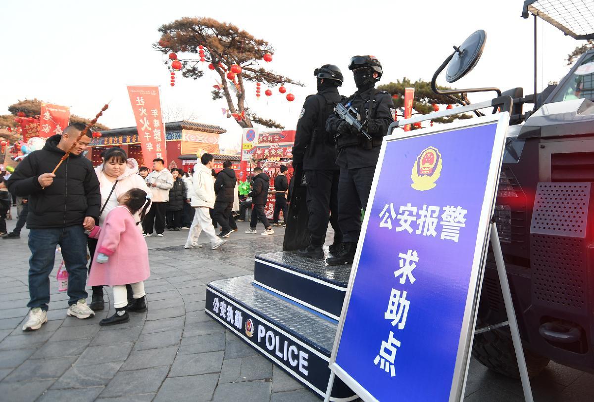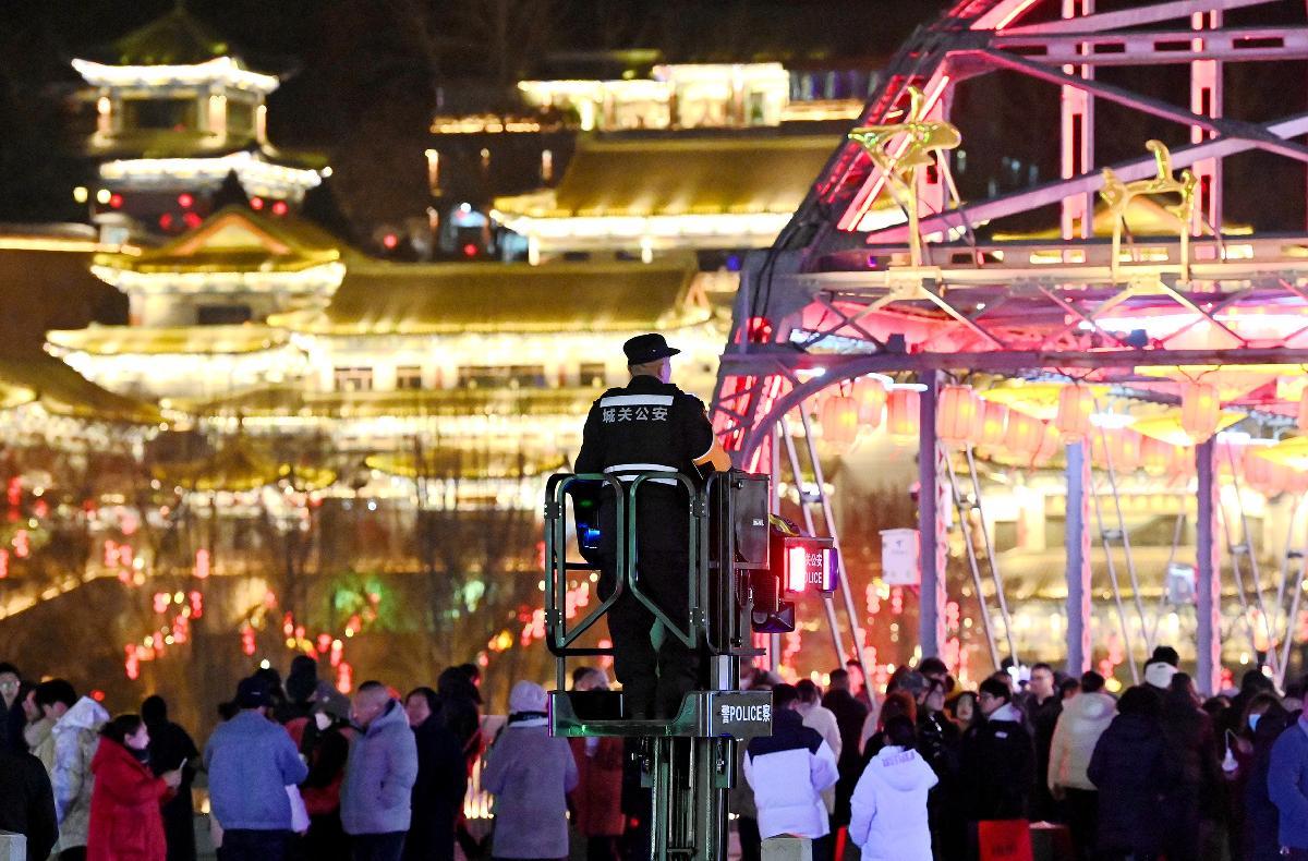 2月17日,河南省??h公安局民輔警在古城景區(qū)定點(diǎn)執(zhí)勤。