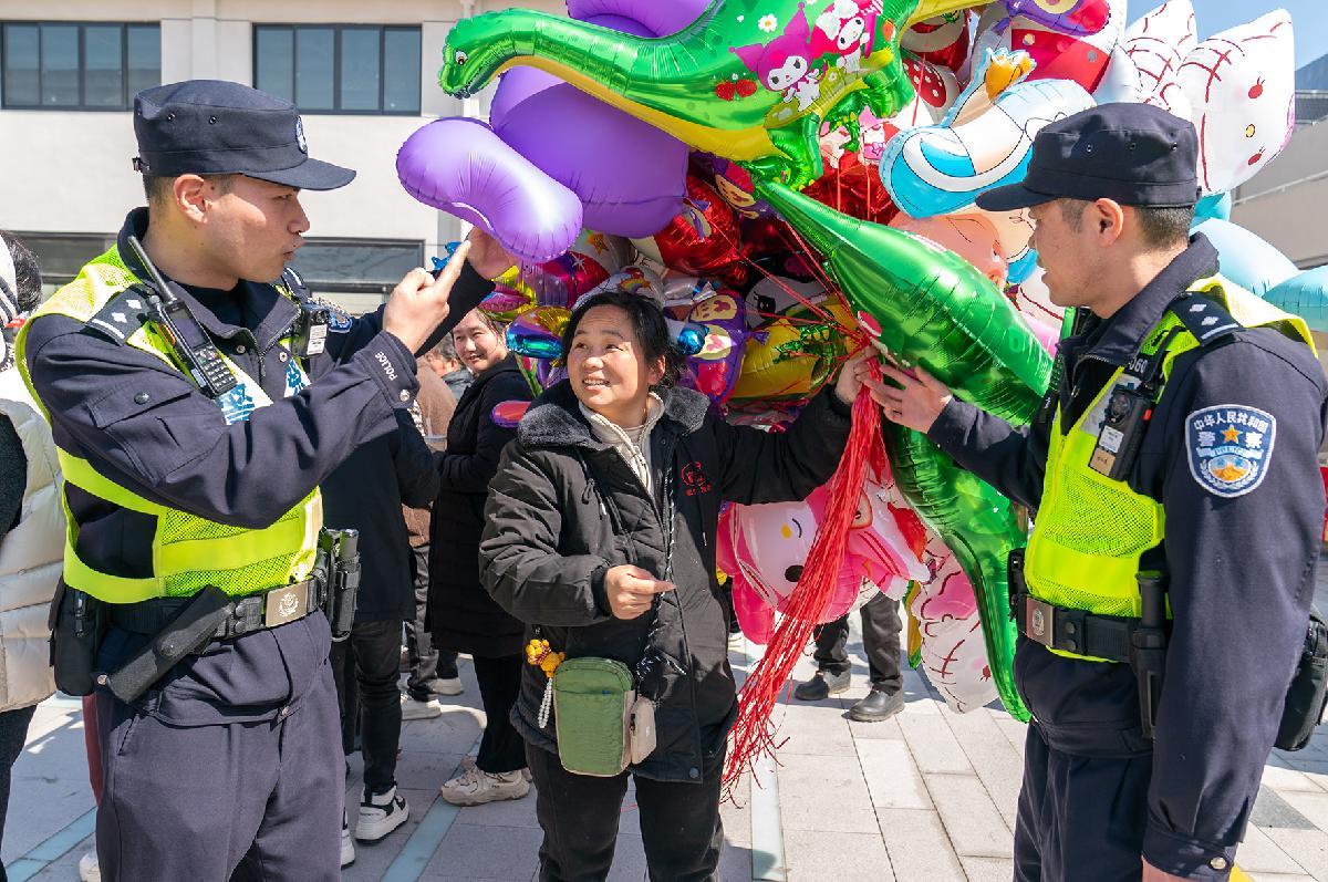2月22日,上海市公安局崇明分局汲浜派出所民警在嘉年華活動(dòng)現(xiàn)場(chǎng)提醒賣氣球的商戶注意防火安全。