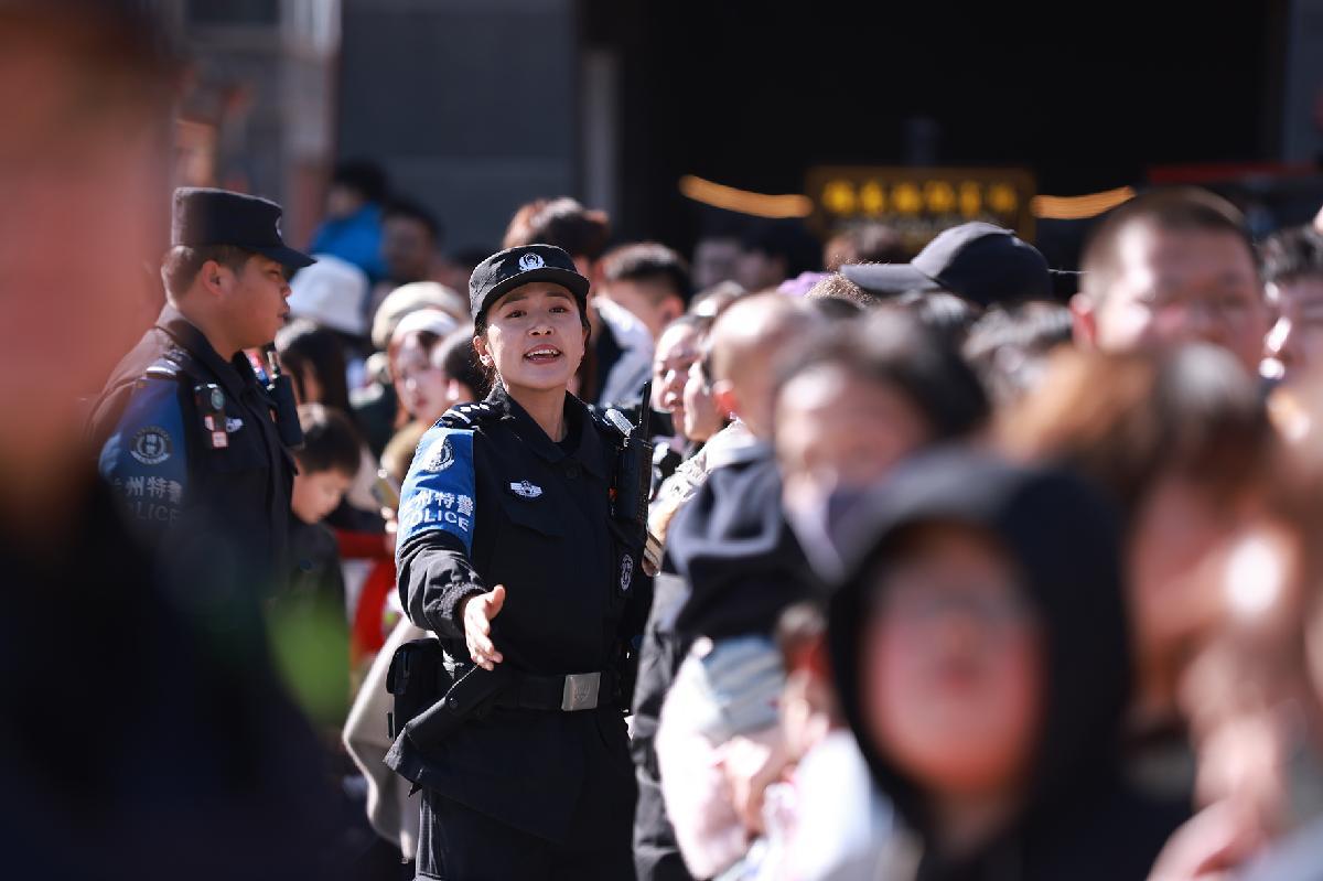 2月20日,甘肅省蘭州市公安局民輔警在蘭州老街非遺踩高蹺表演現(xiàn)場(chǎng)疏導(dǎo)客流、維護(hù)秩序。