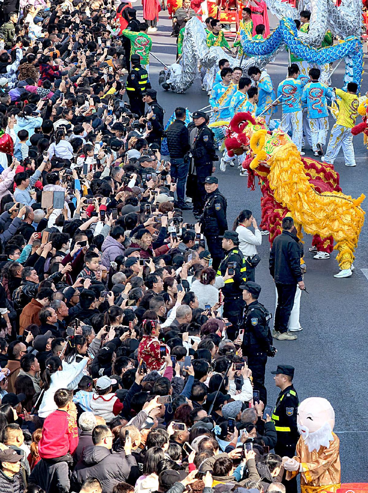 2月21日,江蘇省南通市公安局民輔警在新春民俗巡游活動(dòng)現(xiàn)場(chǎng)執(zhí)勤。