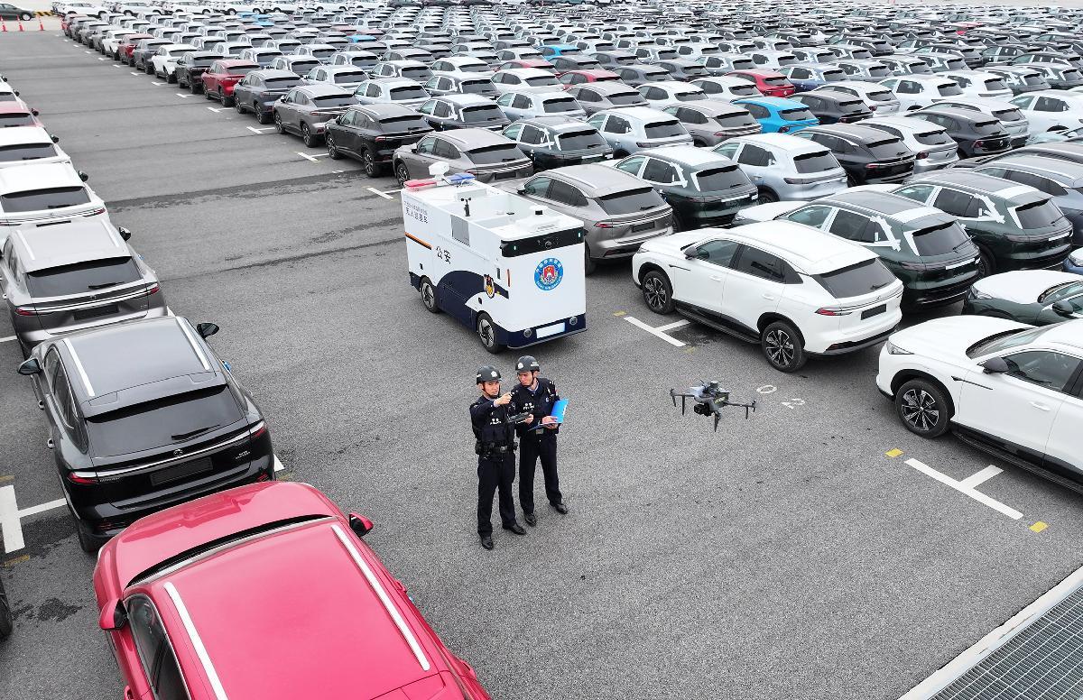 圖為民警使用警用無人機(jī)和無人巡查車在碼頭汽車堆場巡查。
