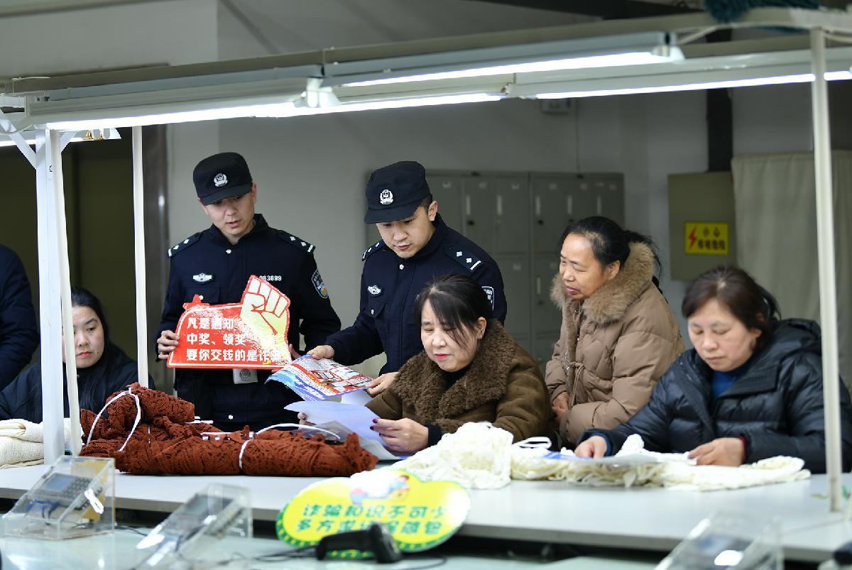 2月24日,安徽省阜南縣公安局經(jīng)濟(jì)開(kāi)發(fā)區(qū)派出所民警在一家紡織企業(yè)車(chē)間為員工宣講防騙知識(shí)。