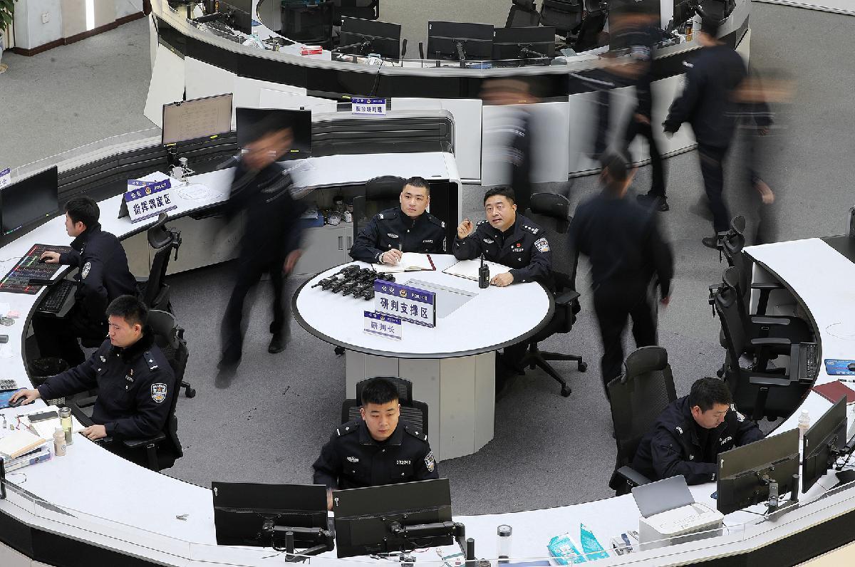3月9日,在鐘祥市公安局“情指行”一體化作戰(zhàn)中心,民警郭威(中)與同事圍坐在監(jiān)控屏幕前,神情專注地分析畫面細(xì)節(jié)、推進(jìn)案情研判。