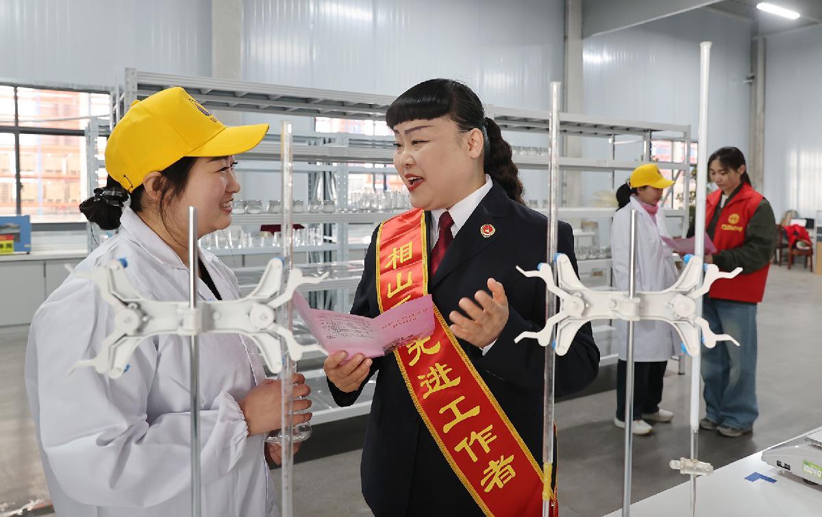 圖為相山區(qū)人民檢察院檢察官、區(qū)先進(jìn)工作者朱溟,在一家玻璃制造企業(yè)向女職工宣講法律知識。