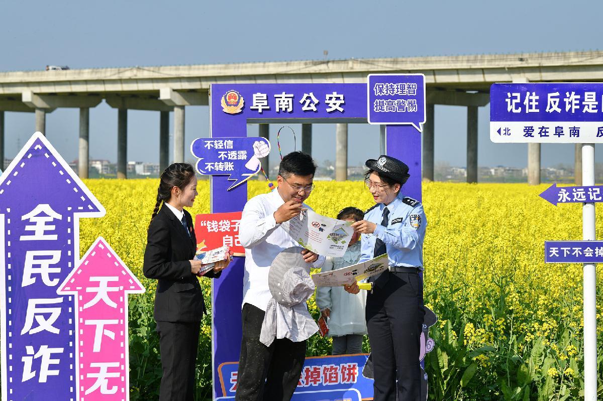 4月1日,安徽省阜南縣公安局經偵大隊民警、阜南縣人民法院工作人員在中崗鎮(zhèn)千畝油菜花景區(qū)向游客宣講反詐知識。