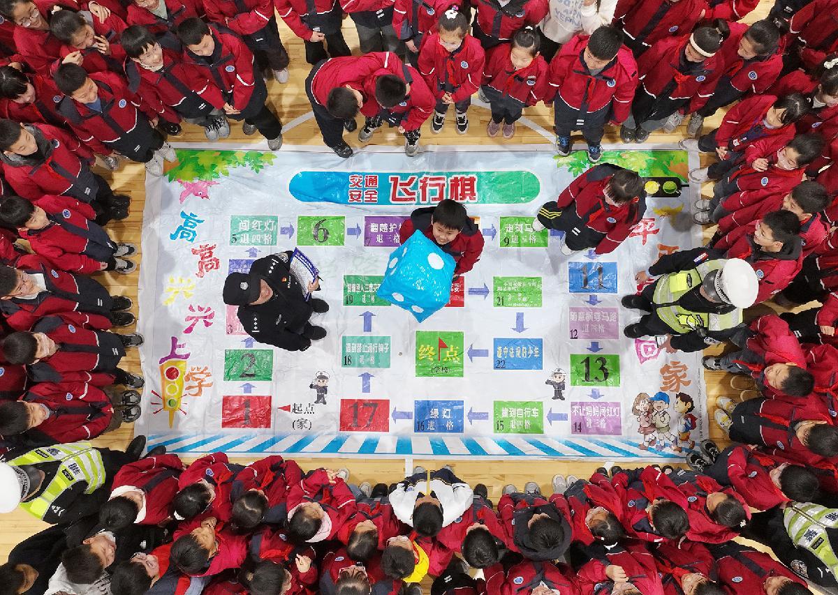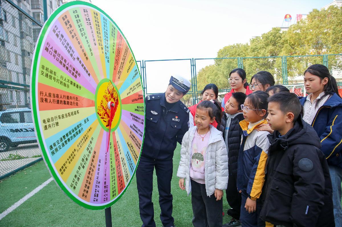3月28日,江蘇省如皋市公安局民警在城南街道建設(shè)社區(qū),通過趣味游戲?yàn)楹⒆觽兤占敖煌ò踩R。