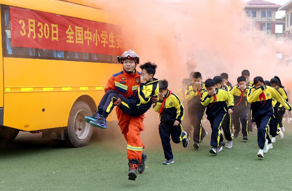 3月30日,是第31個(gè)全國中小學(xué)生安全教育日。山東省棗莊市市中區(qū)東湖小學(xué)學(xué)生在消防救援人員的引導(dǎo)下進(jìn)行校車應(yīng)急逃生演練活動(dòng)。