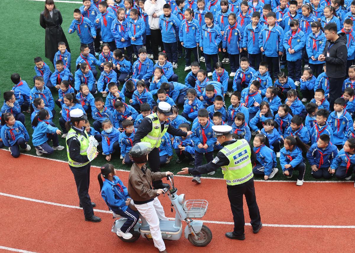 3月30日,在山東省臨沂市郯城縣第三實(shí)驗(yàn)小學(xué),郯城縣公安局交通管理大隊(duì)民警為學(xué)生講解交通安全知識。