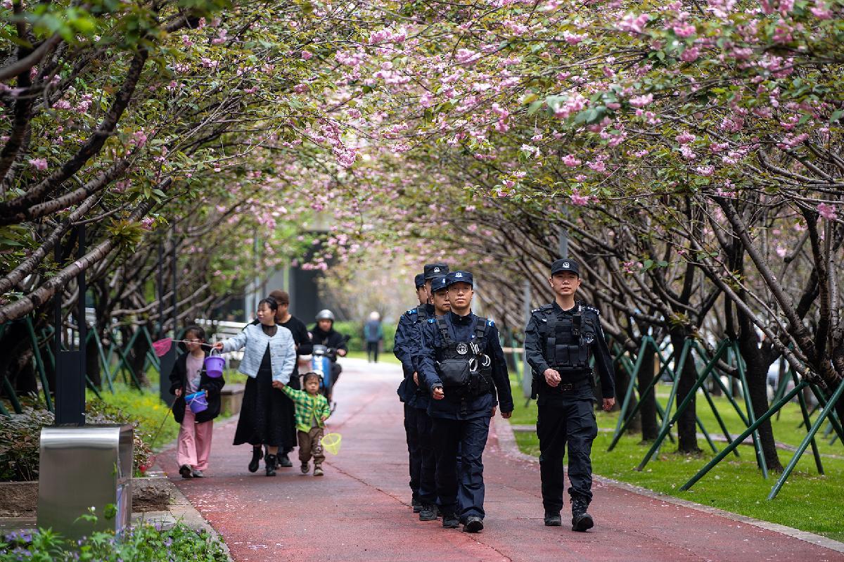 4月12日,浙江省臺州市黃巖區(qū)江北公園晚櫻盛開。臺州市公安局黃巖分局巡特警大隊(duì)落實(shí)動(dòng)態(tài)巡邏機(jī)制,以“警察藍(lán)”守護(hù)“櫻花粉”,將警務(wù)前移到街頭、服務(wù)延伸到群眾身邊。