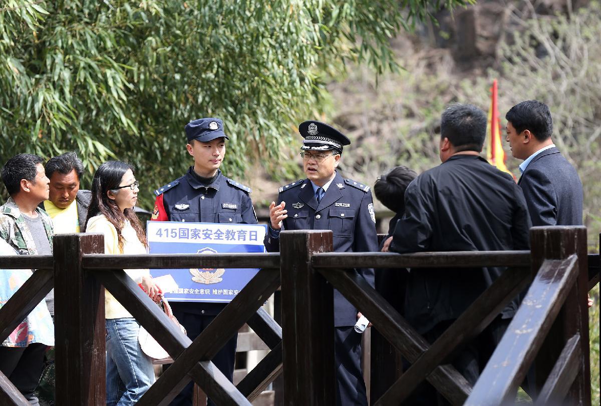 4月12日,在山東省臨沂市郯城馬陵山景區(qū),郯城縣公安局民警為游客普及國(guó)家安全知識(shí)。