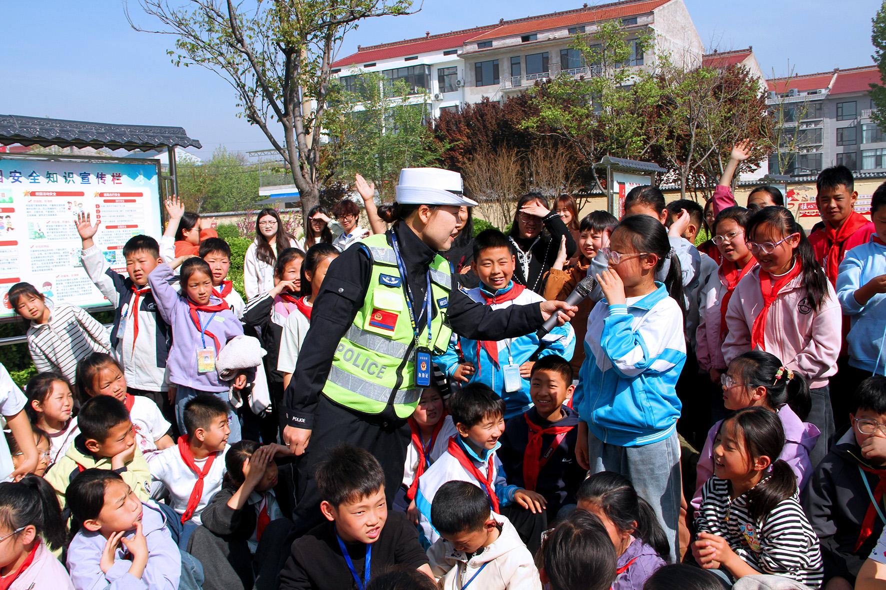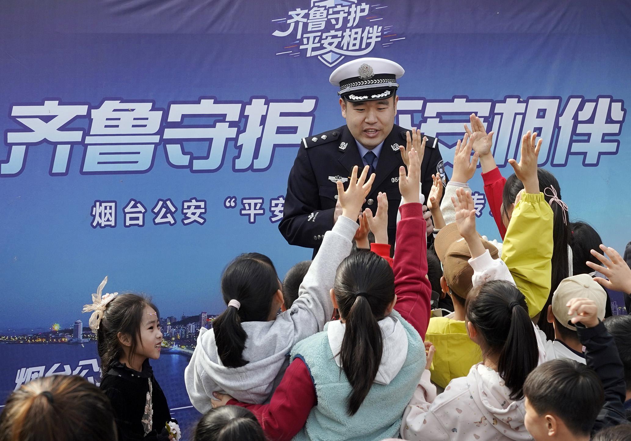4月11日,山東省煙臺市公安局在牟平區(qū)龍湖櫻花大道舉辦“齊魯守護·平安相伴”春日游園會,現(xiàn)場小朋友積極參與交通安全游戲。