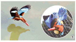 圖① 白胸翡翠落入捕鳥人的“死亡之網(wǎng)”。白胸翡翠已被列入《世界自然保護(hù)聯(lián)盟》2015年瀕危物種紅色名錄ver 3.1無(wú)危(LC)。 本報(bào)記者 鄧新建 攝