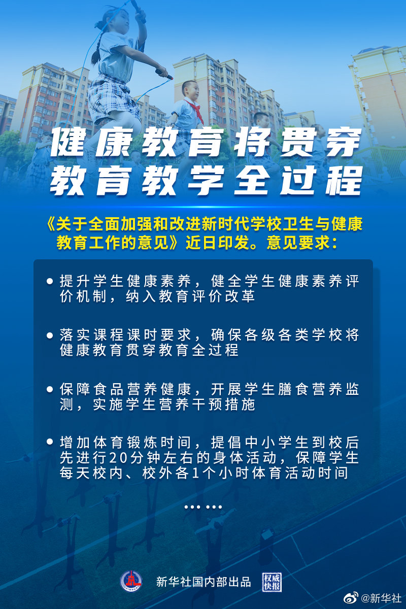 記者3日從教育部新聞發(fā)布會(huì)獲悉,《關(guān)于全面加強(qiáng)和改進(jìn)新時(shí)代學(xué)校衛(wèi)生與健康教育工作的意見(jiàn)》近日印發(fā)。意見(jiàn)要求,將健康教育與德育、智育、體育、美育、勞動(dòng)教育相結(jié)合,融入教育教學(xué)、管理服務(wù)全過(guò)程。①提升學(xué)生健康素養(yǎng),健全學(xué)生健康素養(yǎng)評(píng)價(jià)機(jī)制,納入教育評(píng)價(jià)改革。②明確健康教育內(nèi)容。③落實(shí)課程課時(shí)要求,確保各級(jí)各類學(xué)校將健康教育貫穿教育全過(guò)程。④拓展健康教育渠道。⑤保障食品營(yíng)養(yǎng)健康,開(kāi)展學(xué)生膳食營(yíng)養(yǎng)監(jiān)測(cè),實(shí)施學(xué)生營(yíng)養(yǎng)干預(yù)措施。⑥增加體育鍛煉時(shí)間,提倡中小學(xué)生到校后先進(jìn)行20分鐘左右的身體活動(dòng),保障學(xué)生每天校內(nèi)、校外各1個(gè)小時(shí)體育活動(dòng)時(shí)間。⑦強(qiáng)化心理健康教育。⑧養(yǎng)成健康行為習(xí)慣。(記者胡浩,海報(bào)設(shè)計(jì)楊軼群)