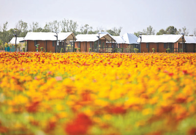 陜西省榆林市補(bǔ)浪河女子民兵治沙連營區(qū)周邊,民宿坐落在花草之間。