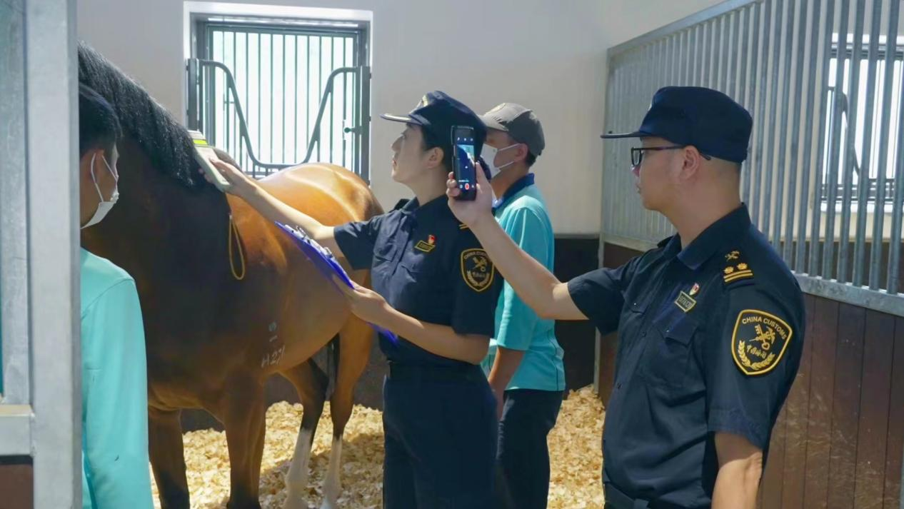 圖為:廣州海關(guān)所屬?gòu)幕jP(guān)關(guān)員通過掃描馬匹芯片核對(duì)出境馬匹身份信息。
