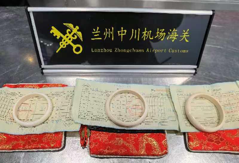 圖為:蘭州海關(guān)所屬中川機場海關(guān)關(guān)員查獲瀕危象牙制品。馬彬攝