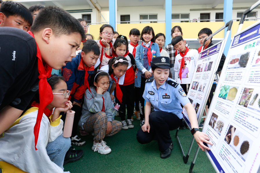 5月26日,浙江省岱山縣公安局民警來到轄區(qū)蓬山小學開展“共建無毒家園 守護紅色根脈”主題宣傳活動。其間,民警向學生講解了植物類、食品飲料類及其他類18種國家實行整類列管的新精神活性物質相關知識,并開展禁毒拼圖、擊碎毒品等互動游戲,進一步提高學生們識毒、防毒、拒毒意識。圖為民警向學生講解禁毒知識。