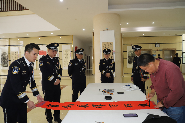 1月10日是我國第二個人民警察節(jié)。當天,海南省昌江黎族自治縣公安局舉行“升國旗、迎警旗”宣誓儀式,并展示詩聯(lián)、書法、美術、攝影等作品,激勵廣大民輔警以更加強烈的政治擔當忠實履行新時代公安使命任務。圖為書法活動現(xiàn)場。