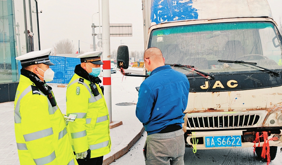 由于連日下雪,為有效預(yù)防道路交通事故的發(fā)生,太原鐵路公安處交警支隊(duì)及時啟動惡劣天氣應(yīng)急預(yù)案,全員上崗,積極應(yīng)對降雪天氣,確保旅客“春運(yùn)”平安出行。圖為1月24日,民警上街排查交通安全隱患。(成鵬攝)