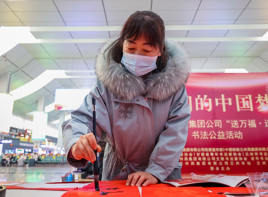 為實現(xiàn)“平安春運、有序春運、溫馨春運,讓旅客體驗更美好”的春運目標(biāo),1月25日蘭州鐵路局在蘭州火車站、蘭州西站開展了以“我們的中國夢”為主題的“送萬福·進(jìn)萬家”書法公益活動?;顒赢?dāng)天,甘肅省的20余名書法家、藝術(shù)家筆走龍蛇、揮毫潑墨,現(xiàn)場創(chuàng)作春聯(lián)和“?!弊?,為候車旅客送上新春的祝福。