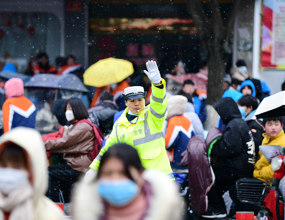 2月17日,安徽省阜南縣交警冒風(fēng)雪中在城區(qū)第一小學(xué)周邊路段護(hù)送學(xué)生放學(xué)。連日來,該縣中小學(xué)校陸續(xù)開學(xué),阜南縣公安局交管大隊啟動“護(hù)學(xué)崗”,疏導(dǎo)學(xué)校周邊交通秩序,確保道路暢通和師生上下學(xué)出行安全。