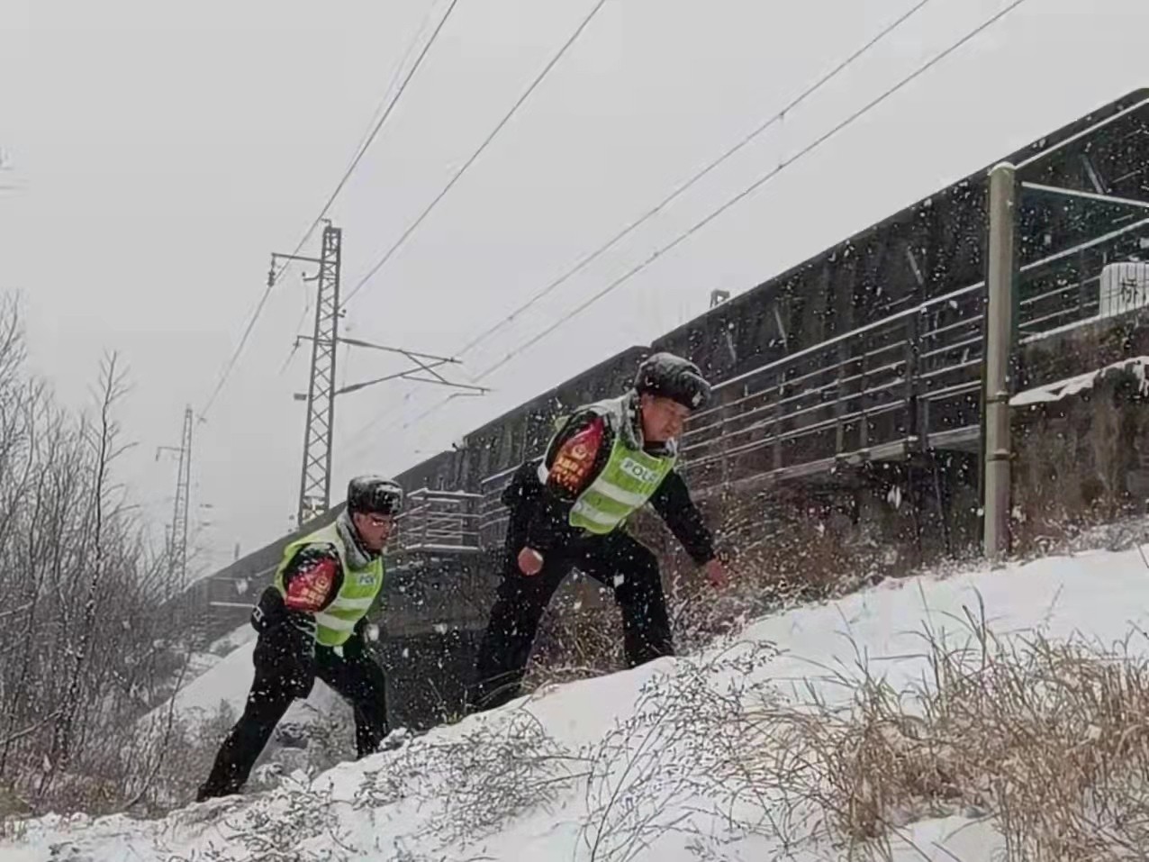 為積極應(yīng)對冰雪天氣,確保旅客平安出行,大同鐵路警方全警奮戰(zhàn)在鐵路安全保障的第一線,成為雪景中一道靚麗風(fēng)“警”線。圖為民警對線路重點(diǎn)區(qū)段、重點(diǎn)部位巡邏檢查。 東海 攝