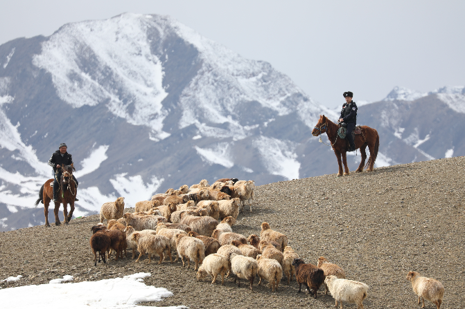 近日,隨著氣溫逐步回暖,新疆維吾爾自治區(qū)阿勒泰地區(qū)青河縣的牧民們都陸續(xù)開始了轉(zhuǎn)場(chǎng)作業(yè)。連日來(lái),阿勒泰邊境管理支隊(duì)青河邊境管理大隊(duì)阿尕什敖包邊境派出所選派騎馬經(jīng)驗(yàn)豐富的民警成立“牧羊人”小分隊(duì),深入邊境轄區(qū)幫助牧民們共同放牧,全力保障牧民轉(zhuǎn)場(chǎng)的順利進(jìn)行。圖為民警助力牧民轉(zhuǎn)場(chǎng)。