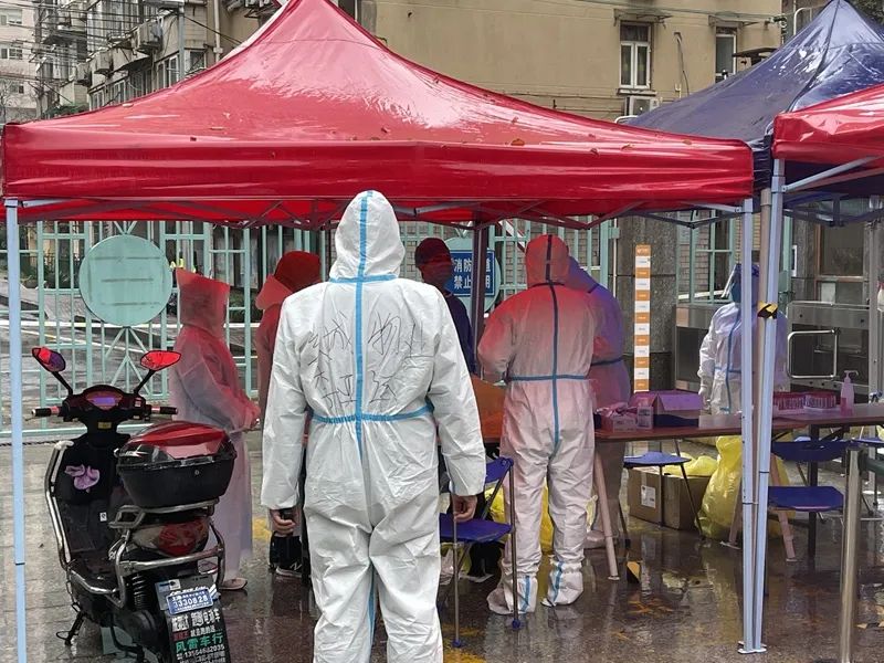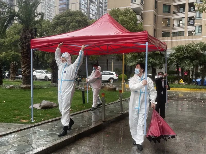 “許多外籍住戶對我們的工作評價非常高,因為他們從沒見過這樣一支有力的隊伍?!泵却罕硎?,從凌晨接到核酸篩查的任務(wù),短短的幾個小時,從無到有,居委與物業(yè)就完成了臨時的檢驗棚的搭建,一米線設(shè)置、桌椅板凳、引導(dǎo)標志、動線安排……一支志愿者隊伍也誕生了。