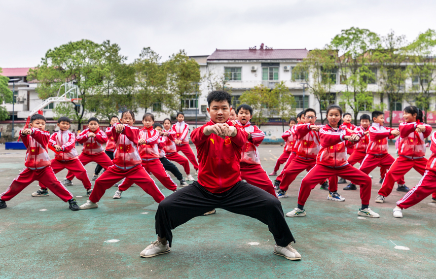 3月27日,上栗縣雞冠山中心小學武術社團學生,正在教師帶領下開展武術訓練。楊娟攝