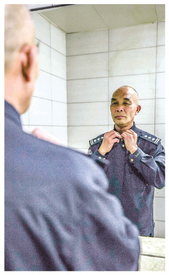 圖③ 鄭國慶對著鏡子認(rèn)真地整理自己的著裝,最后一天在崗,警容風(fēng)紀(jì)不能亂。