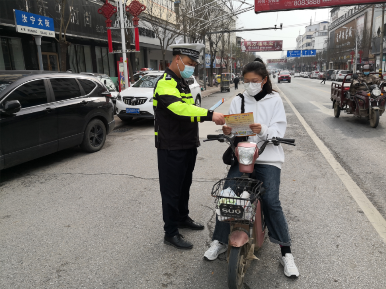 連日來,河南省汝南縣公安局交警大隊(duì)民警走上街頭開展“一盔一帶,安全常在”專項(xiàng)宣傳。圖為民警向過往群眾發(fā)放“一盔一帶”交通安全宣傳頁。