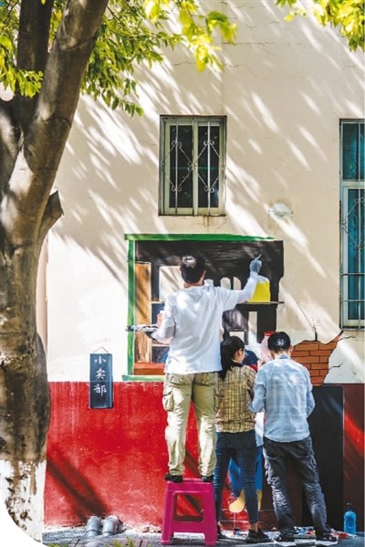 4月28日,云南省玉溪市峨山彝族自治縣桂峰小區(qū),人們在老舊小區(qū)的墻面上繪制墻畫。新華社記者 胡超攝