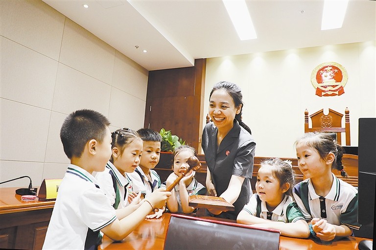 日前,浙江省江山市人民法院開展了暑期開放日活動(dòng),江山市城東實(shí)驗(yàn)學(xué)校、城東幼兒園50余名少年兒童走進(jìn)法院,先后參觀了訴訟服務(wù)大廳、審判法庭等場所,詳細(xì)了解人民法院工作職責(zé)、審判法庭基本設(shè)置,近距離體驗(yàn)庭審活動(dòng),接受了一次生動(dòng)、直觀的法治教育。圖為同學(xué)們在了解法槌的相關(guān)知識。