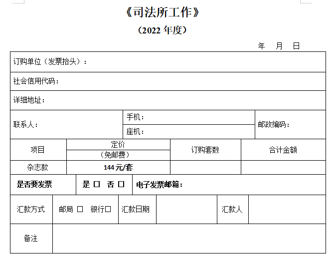 單位匯款時請務(wù)必標(biāo)明“司法所工作+訂購套數(shù)”,個人匯款請務(wù)必注明“單位名稱+中國司法”。