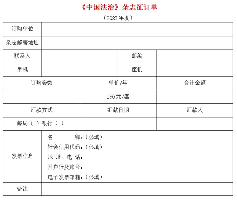 ★匯款時請務(wù)必標明“中國法治+訂購套數(shù)”,個人匯款另需注明“單位名稱”。