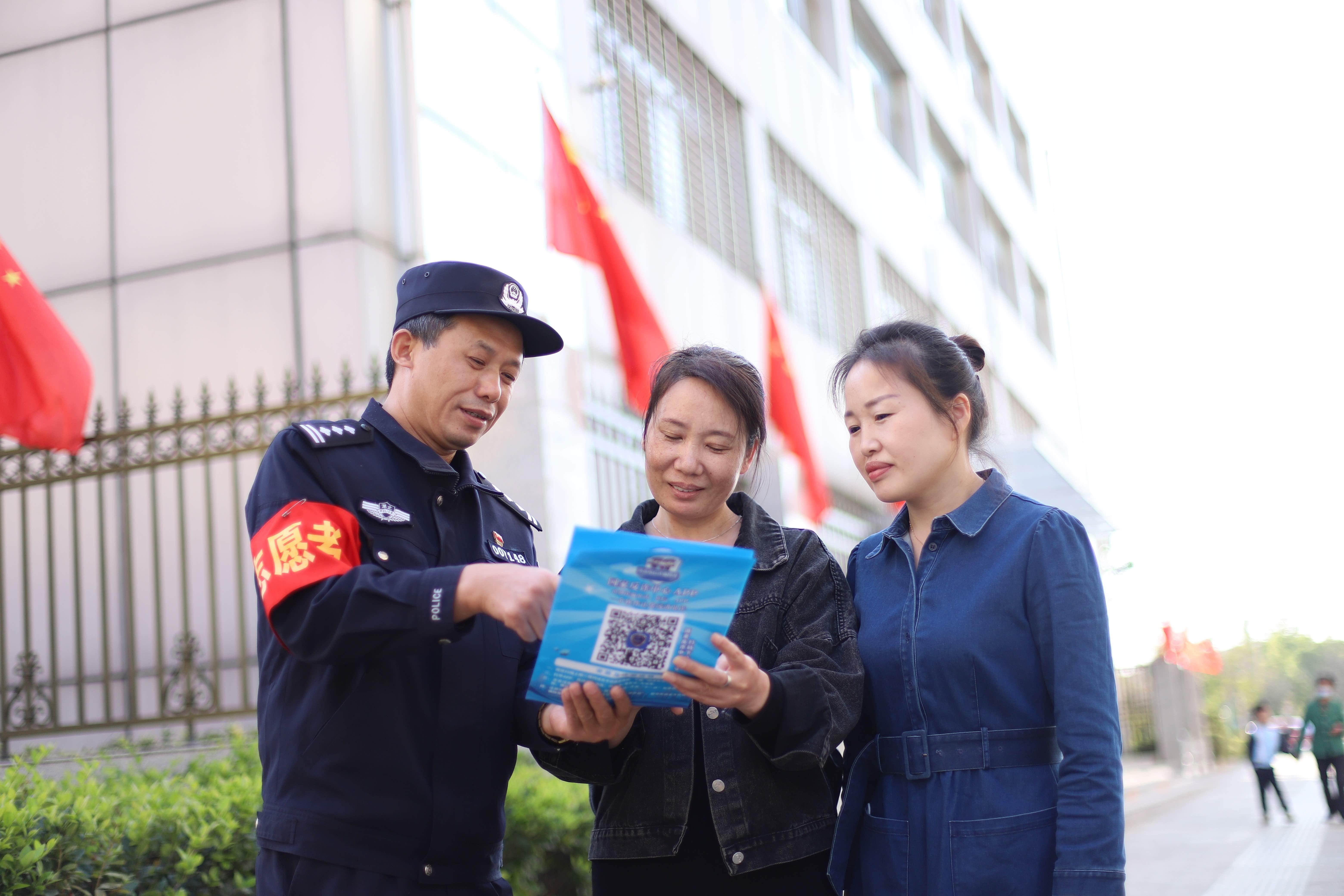 長(zhǎng)安社區(qū)電詐警情曾居高不下,姜亨祝主動(dòng)爭(zhēng)取多方力量支持,開(kāi)展六輪“掃樓”入戶宣傳,“一輪下來(lái)至少一個(gè)月,不落一戶”。姜亨祝每天編發(fā)、轉(zhuǎn)發(fā)防詐騙信息到59個(gè)微信群,對(duì)居民浸入式灌輸防詐知識(shí)。他還將自己編寫(xiě)的反詐提示錄入小喇叭內(nèi),在轄區(qū)開(kāi)展日常巡邏時(shí),沿路播放。天天在群里“打廣告”,有些居民嫌煩,將姜亨?!疤摺背觯蠼蛔∷磸?fù)做思想工作,又將他拉了進(jìn)去?!胺凑褪琴囋谌豪锊蛔吡??!彼χf(shuō)。